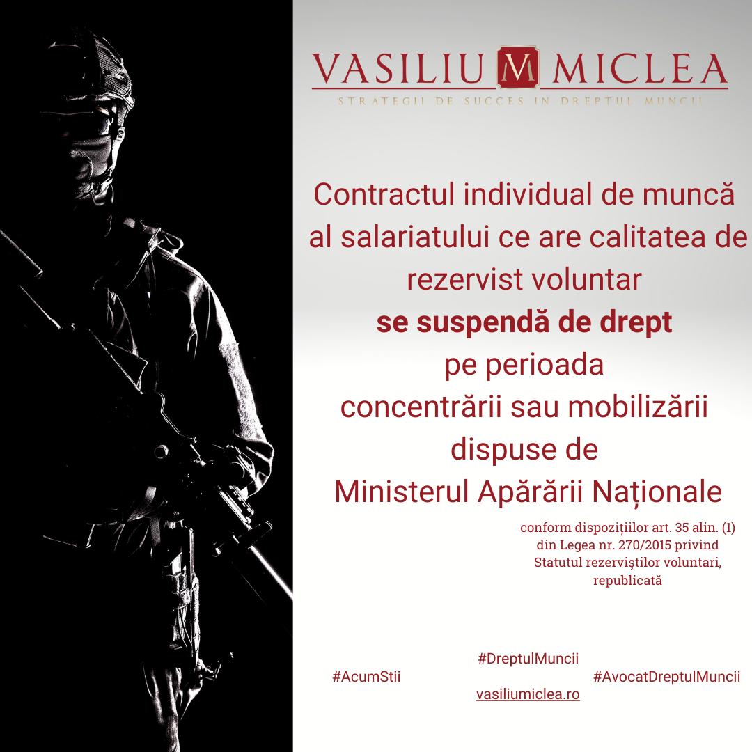 Un astfel de caz este și Legea nr. 270/2015 privind Statutul rezerviștilor voluntari, republicată. Potrivit acestei legi, „Angajatorii suspendă raporturile de muncă sau de serviciu, după caz, cu rezerviștii voluntari şi cu persoanele care au semnat angajamentul prevăzut la art. 14 alin. (4), pe perioada participării acestora la concentrare/mobilizare, conform contractului, sau la instruirea inițială prevăzută în angajament”.